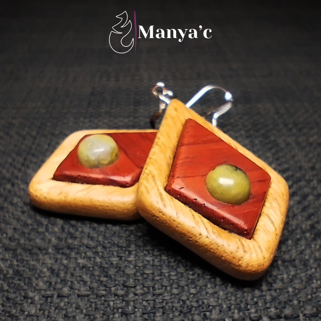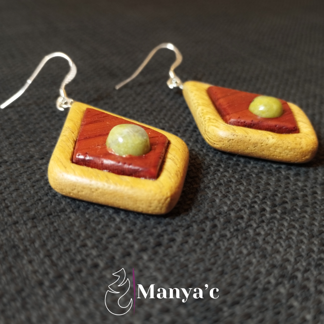 - Boucles d’oreille en bois de Movingui et Padouk et pierre naturelle de Serpentine (Origine: local, montagne du Costabona, Catalunya)