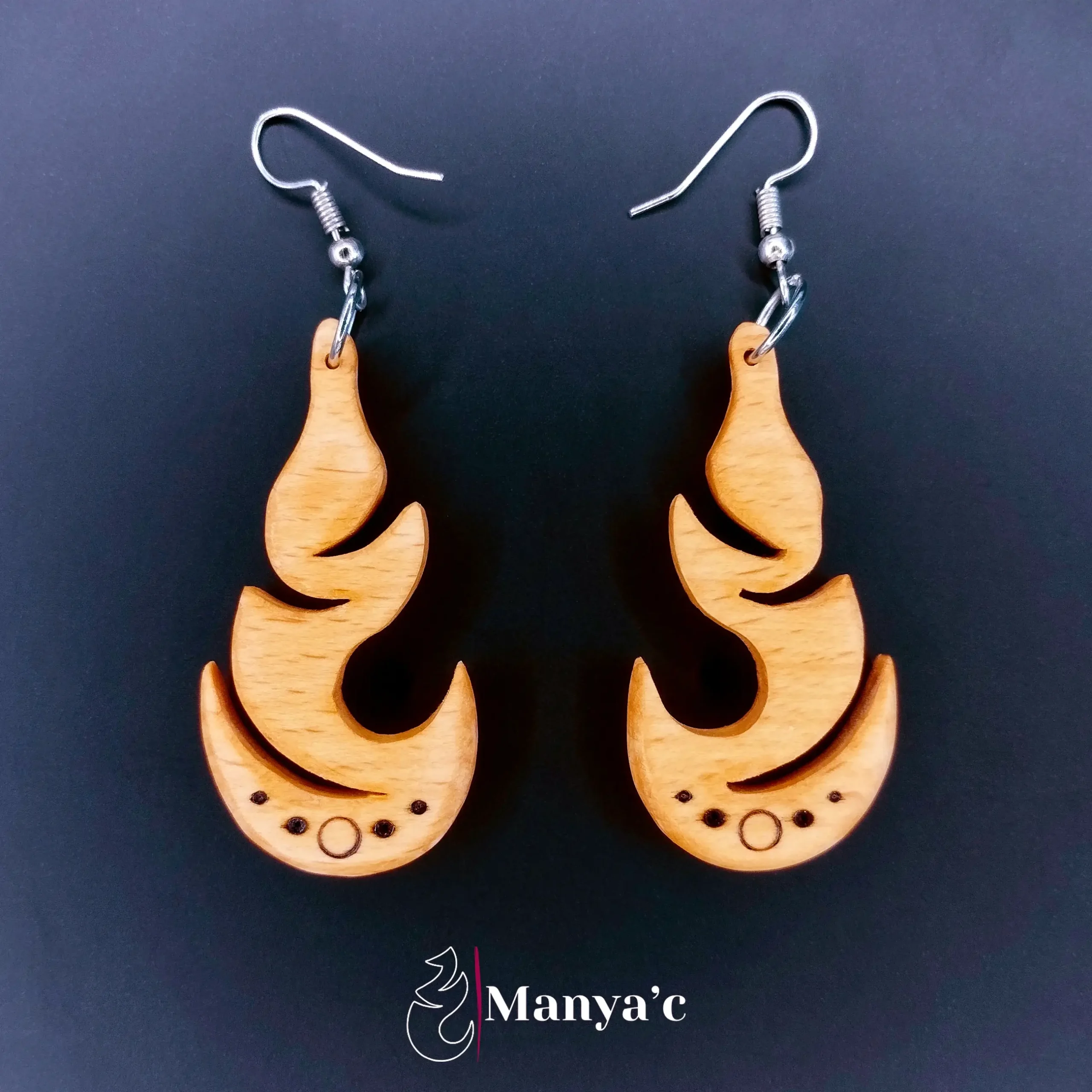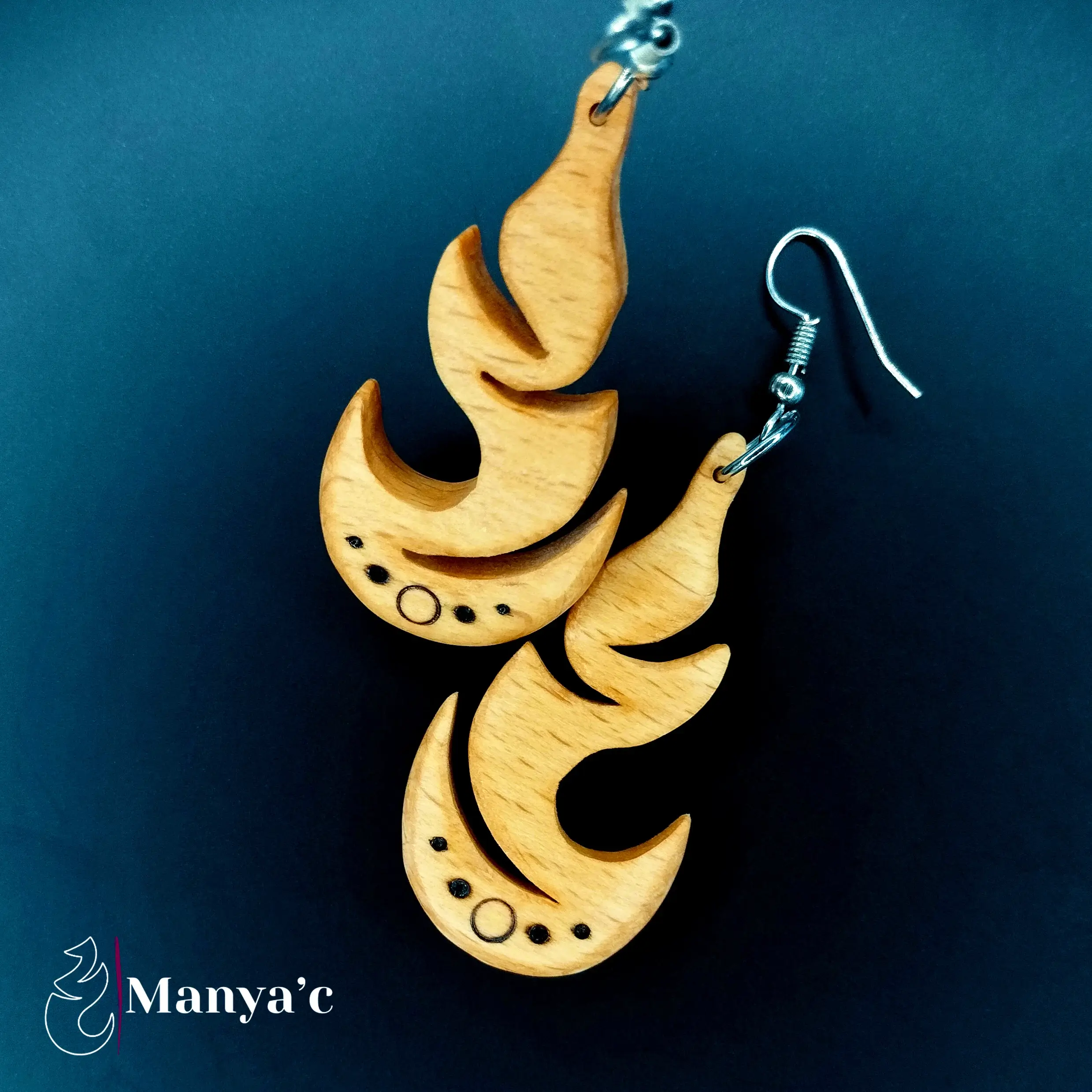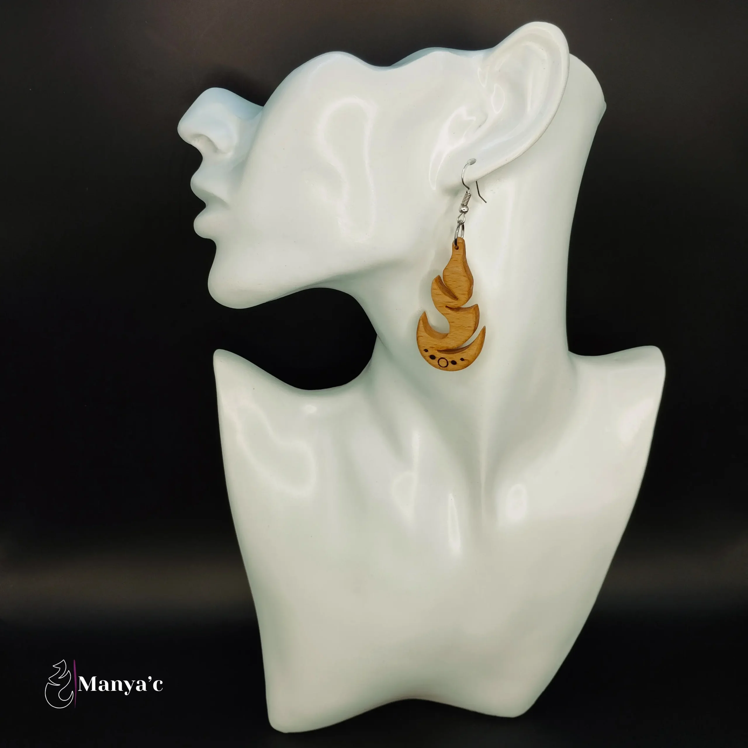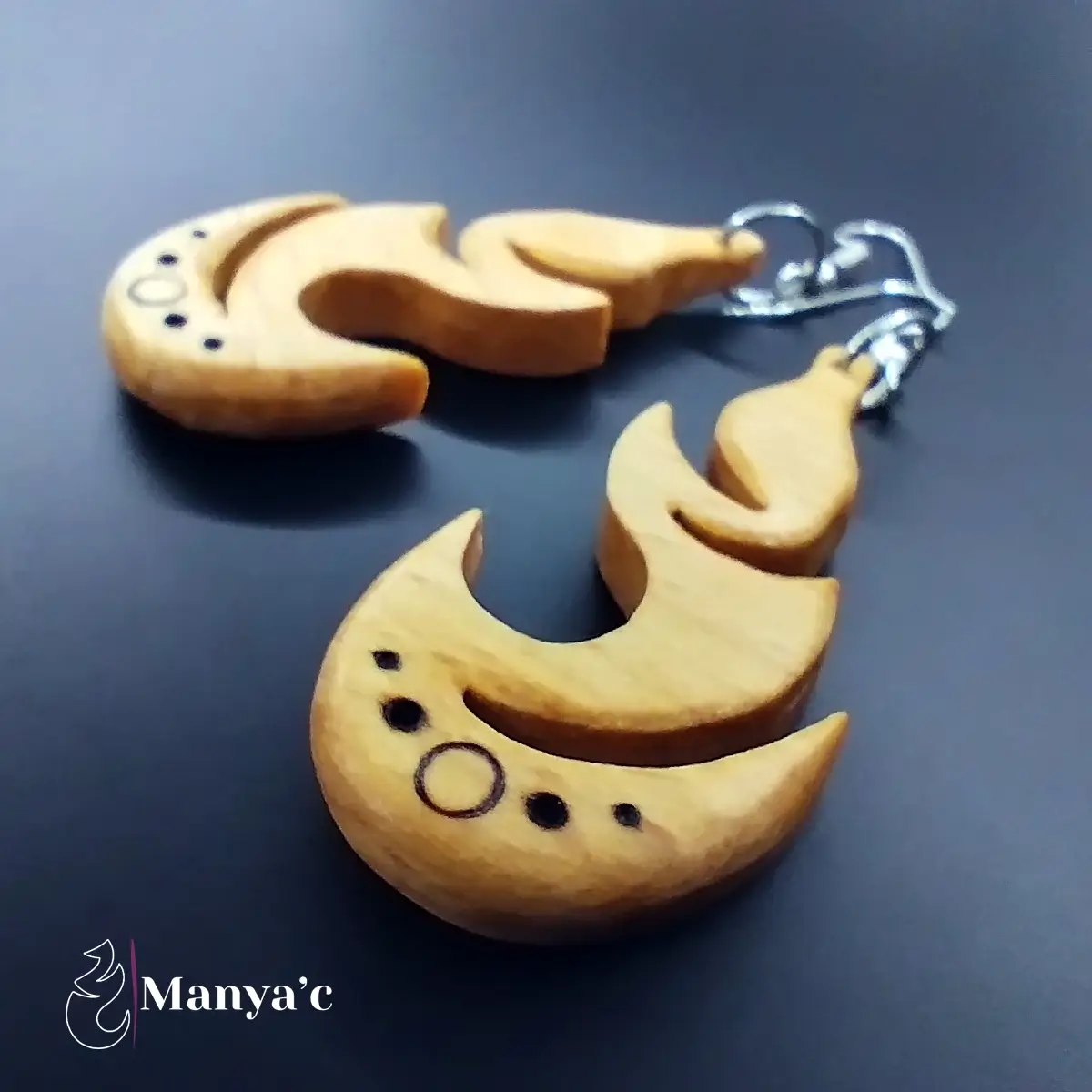 Le bois brûlé par la pyrogravure apporte un contraste saisissant à ce bijou.